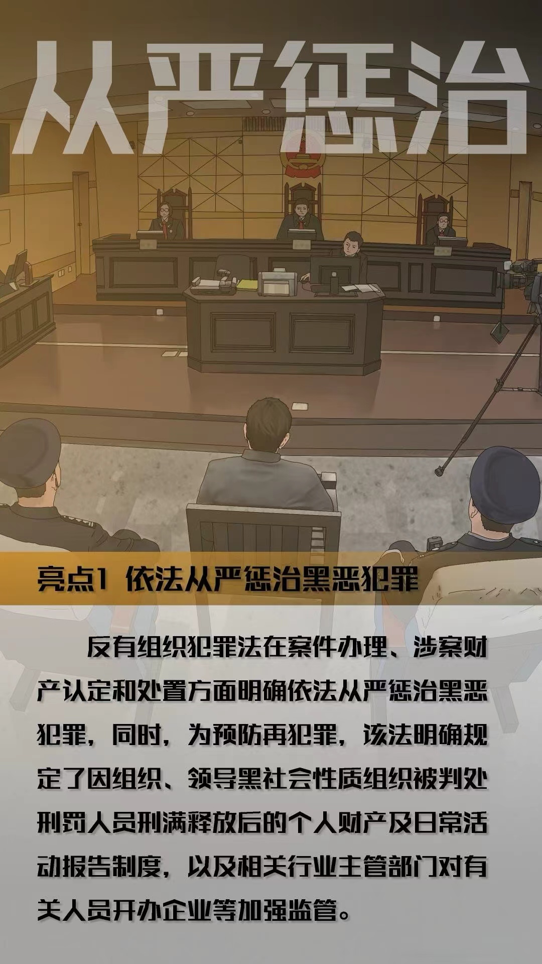 亮点一:依法从严惩治黑恶犯罪。在案件办理上,对有组织犯罪的组织者等严格把握取保候审等适用条件,充分适用相关刑罚,还可采取多种羁押措施;在涉案财产处置上,可全面调查财产状况,对可能系违法所得的财产等依法追缴、没收;在预防再犯罪方面,明确规定了相关人员刑满释放后的报告义务,并强化行业主管部门的监管职责。